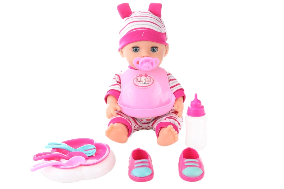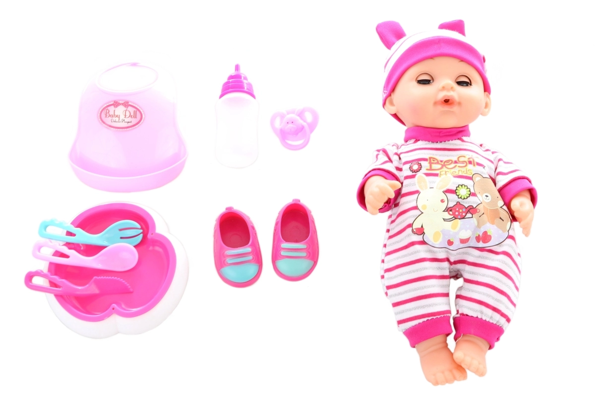 A szett része a cipőcske, műanyag előke, cumisüveg, tányér, evőeszközök és további kiegészítők a változatos fantáziajátékhoz.