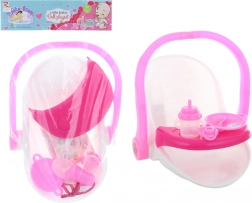 Praktikus műanyag baba hordozó bőséges felszereléssel a gondoskodó szülő szerepjátékához. A csomag tartalmaz egy tányért, evőeszközt, pelenkát, cumisüvegeket és további kiegészítőket. A kompakt méreteknek köszönhetően a hordozó könnyen szállítható, és nagyszerű a gyermeki képzelet és szerepjáték támogatásához. 3 éves kortól ajánlott.