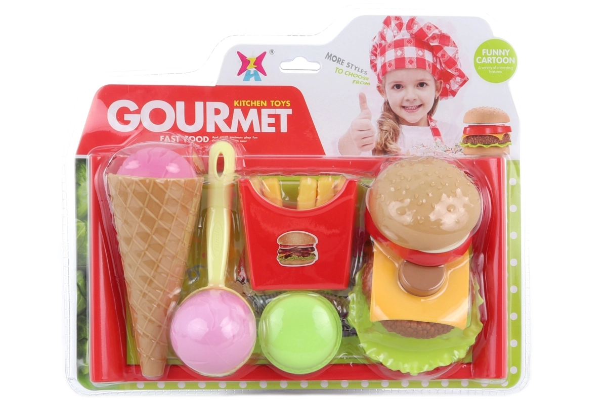 Szórakoztató műanyag ételkészlet gyerekeknek tálcával, konyhás vagy éttermes szerepjátékhoz. Tartalmaz tölcséres fagyit, fagyigombócot fagyiskanállal, makaront, hasábburgonyát és szétszedhető hamburgert egyes hozzávalókra. Ideális a képzelet fejlesztésére, a finommotorika és a közös játék támogatására.