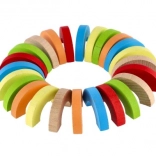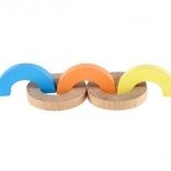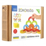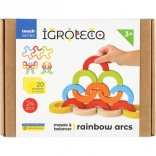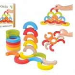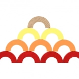 A szivárvány ívek és félkörök toronnyá, híddá vagy egyensúlyi kihívássá is rendezhetők. A gyerekek így fejlesztik koncentrációjukat, stabilitásukat és térérzékelésüket.