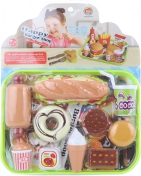 A szettben hotdog, fánk, kekszek, fagylalt, ital és további kiegészítők találhatók a valósághű főzős szerepjátékhoz. Remek ajándékötlet, és nagyszerű kiegészítője a gyerekkonyhának vagy a játékboltnak.