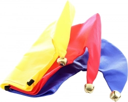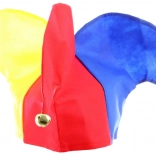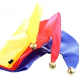 Színes bohócsapka sárga, piros és kék színekben, fém csengőkkel a játékos csilingelő hatásért minden mozdulatnál.