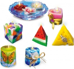 Ezzel a nagy csomaggal akár 9 gyertyát is készíthet otthona kényelmében. Különféle gyertyaszínek és -formák (szív, görögdinnyés, tengeri, úszó, sajt és egér, mozaik stb.). A csomag mindent tartalmaz a készítéshez (paraffin, öntőformák, színezék, kanócok, akrilfestékek, ragasztó, csillámok, üveggyöngyök, szaténszalagok stb.). A készlet tartalmaz például viasalapot, sablonokat, pohárkákat, formácskákat, drótot, gyöngyöket, kagylókat, díszszalvétát, festékeket, szalagot, ragasztót, zsinórt, viaszkrétákat és még sok mást. A csomag mérete: 30 x 44 x 6 cm. 7 éves kortól. EURÓPÁBAN KÉSZÜLT