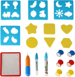 A csomag tartalma: bélyegzők, sablonok, vizes filcek és ecset. A gyerekek formákat, színeket tanulnak és fejlesztik finommotorikájukat.