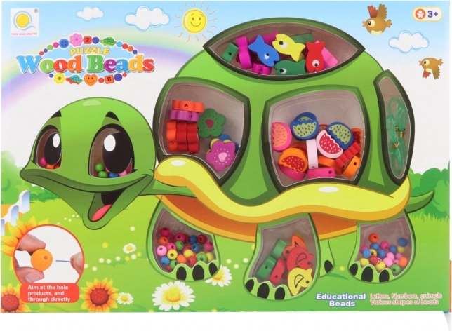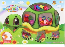 Kreatív fa gyöngykészlet teknős motívummal 3 éves kortól, amely fejleszti a finommotorikát és a fantáziát. Sok színes forma és fűzős zsinór található benne, praktikus csomagolásban kb. 28 × 19,5 × 2,5 cm.