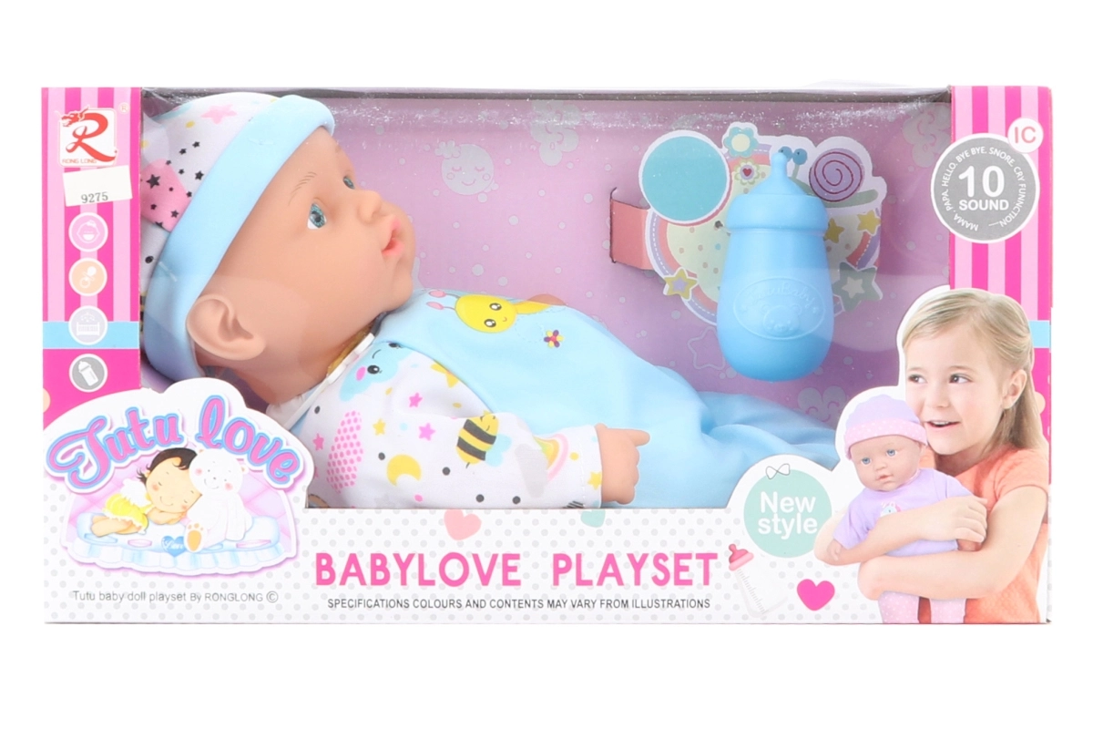 Aranyos baba puha, vászon testtel, amely örömet szerez minden gyermeknek. Elemmel 10 különböző hangot ad ki, a játék része egy cumisüveg az etetéshez. Az AG13 elemek a csomag részei, így a móka azonnal kezdődhet. Ideális ajándék 3 éves kortól.