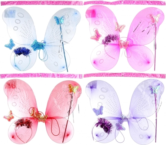 Gyerek pillangó jelmez: csillogó, drótvázas szárnyak, fejpánt és pálca. Könnyű, kényelmes, ideális farsangra. 1 db csomag, vegyes színek.