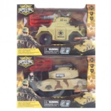 Katonai készlet, ami tartalmaz egy páncélozott járművet és egy katonát, ideális kis katonai rajongók számára. A jármű ágyúja lehetővé teszi narancssárga rakéták kilövését a valósághű akcióhoz.