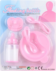Baba kiegészítő készlet ideális anyuka szerepjátékokhoz, tartalmaz cumisüveget, cumit, tányért és evőeszközt. Tökéletes kiegészítő minden kis gondozónak.