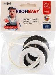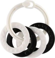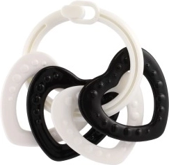 Stílusos fekete–fehér gyűrűszett négy formával – ideális első játék babáknak. A kontrasztos minták támogatják a vizuális stimulációt, a változatos felületek fejlesztik a tapintást, a könnyű kialakítás pedig megkönnyíti a fogást a kis kezek számára. Alkalmas újszülöttkortól.