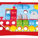 A masszív műanyag kivitel tartósságot és hosszú élettartamot biztosít. A gyerekek újra és újra behelyezhetik a csapokat, saját mintákat alkothatnak, így fejlesztve a kéz–szem koordinációt és a koncentrációt. A praktikus csomagolás otthonra és útra egyaránt alkalmas.
