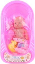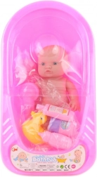 Aranyos műanyag babácska teljes fürdőkészlettel a kis kádba, amely minden gyermeket megörvendeztet. A készlet tartalma: kád, zuhany, kiskacsa, sampon, hintőpor, mosdóruha és kb. 23 cm hosszú baba. Ideális játék a fantázia és a gondoskodás fejlesztésére, 1 éves kortól ajánlott. Remek választás szerepjátékhoz és a finommotorika fejlesztéséhez.