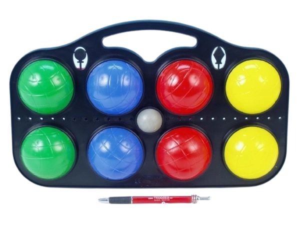 Nyolc darab műanyag petanque golyó készlete, amely ideális szórakoztató kültéri tevékenységekhez. Minden golyónak egyedi színe van a könnyű azonosítás érdekében a játék során. A készlet praktikus csomagolásban érkezik, amely megkönnyíti a tárolást és az iskolai golyók szállítását.