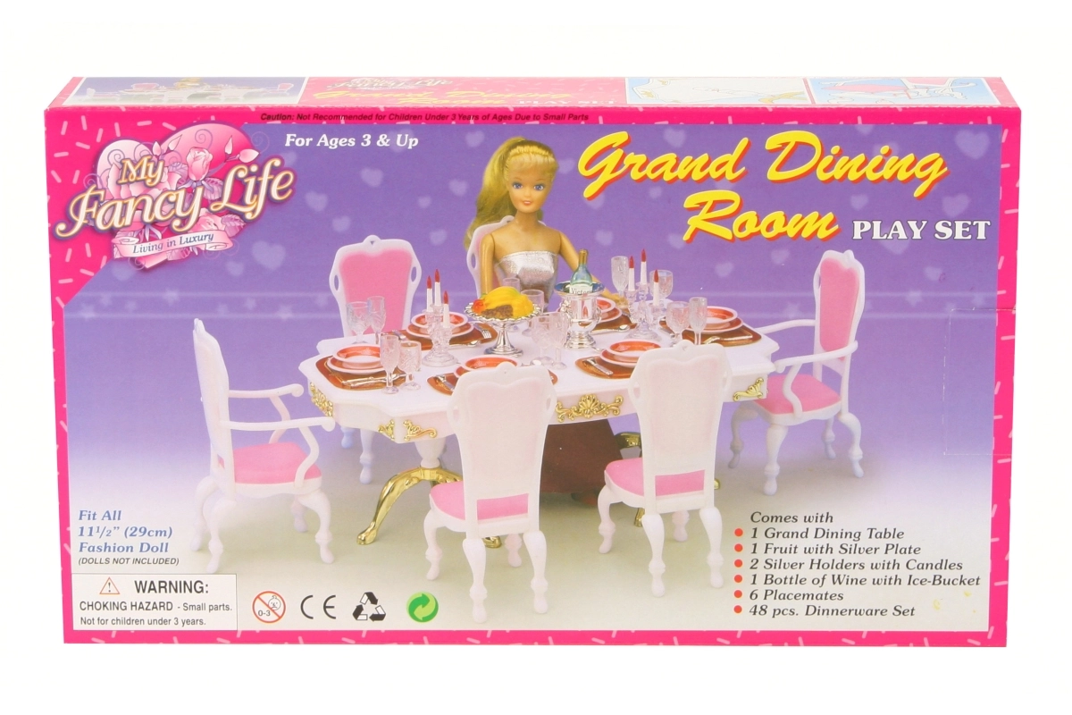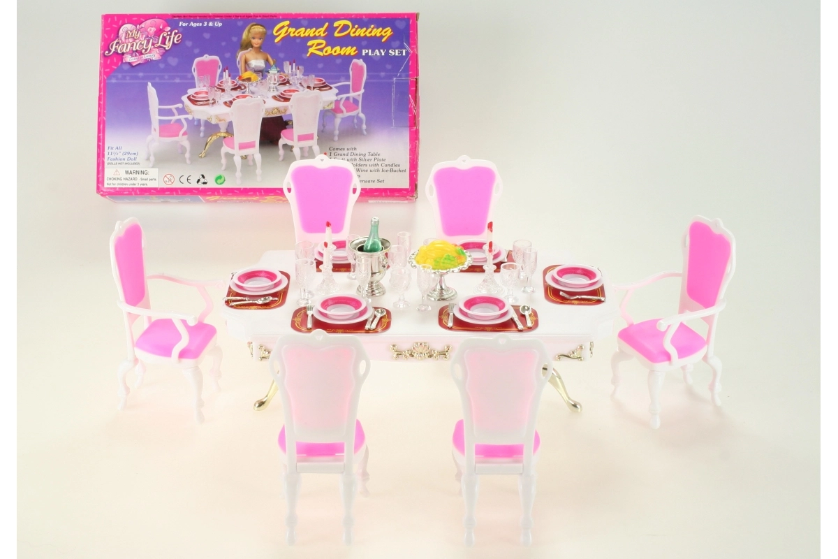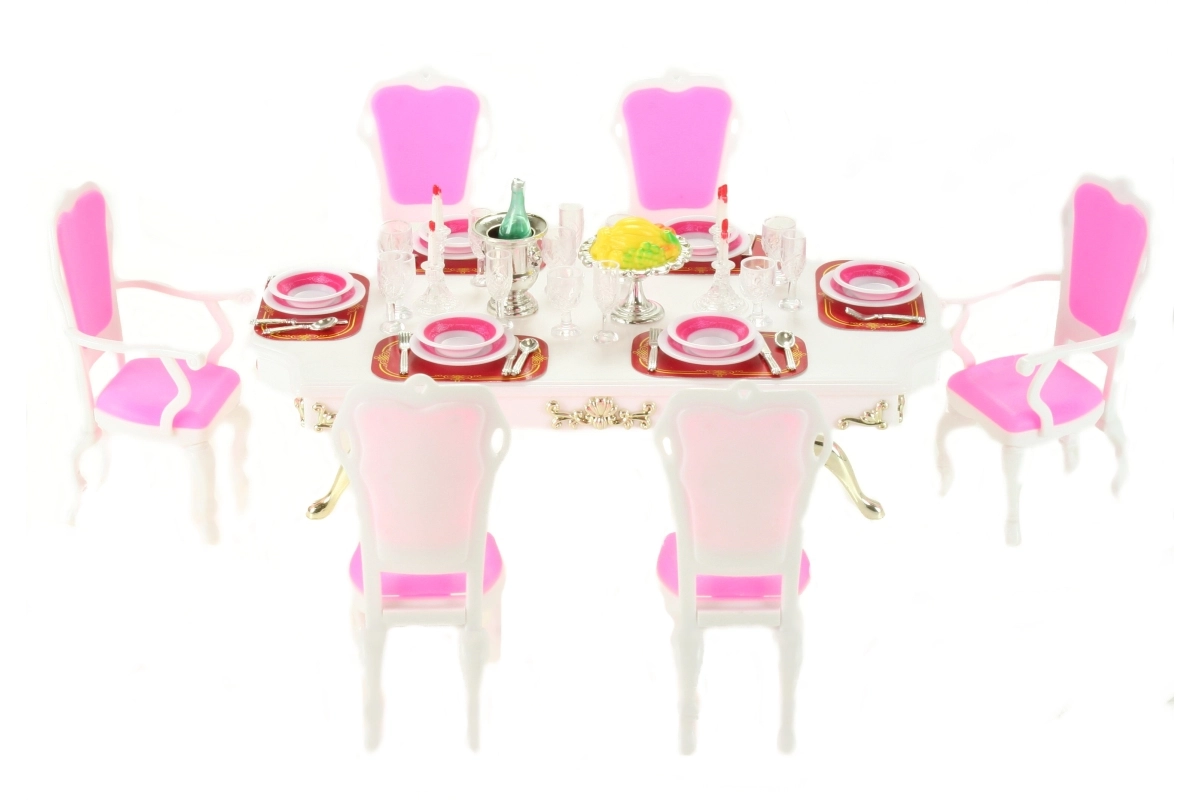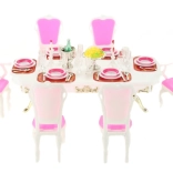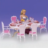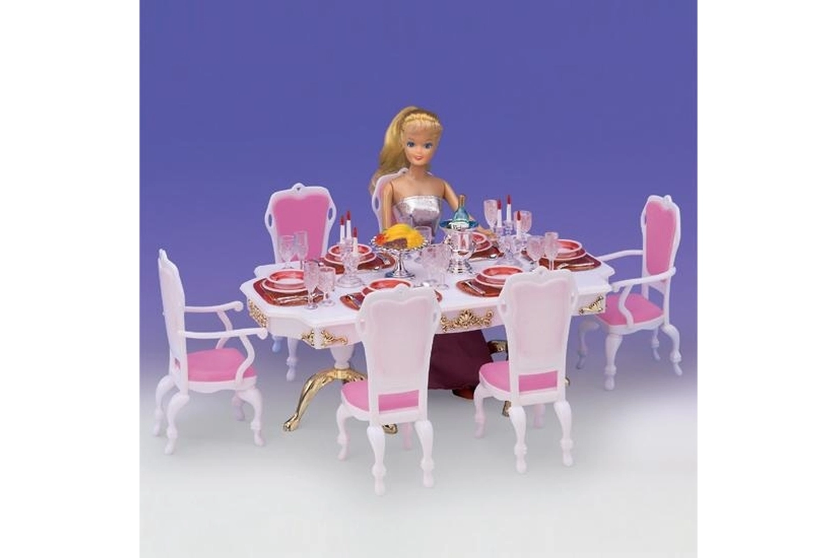 A Glorie stílusos babás étkezőkészlete elegáns étkezővé varázsol minden szobácskát. Tartalmaz egy nagy műanyag asztalt, 6 széket (ebből 2 karfával) és gazdag asztalterítéket, beleértve poharakat, tányérokat és evőeszközöket. Ideális kreatív játékhoz 3 éves kortól.