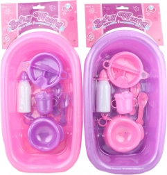 Ajándékozza meg kis anyukáját a kedvenc babájáról való tökéletes gondoskodás élményével ezzel a praktikus műanyag babakáddal. A csomag gazdag kiegészítő készletet tartalmaz – bilit, cumisüveget, itatópoharat, kanalat, villát és etetőtálat – mindent a szórakoztató és élethű szerepjátékhoz.
