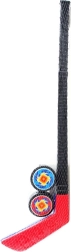 Két műanyag hokiütő hálóban, kb. 57 cm hosszú, mindegyik más színű, és 2 korong. 3+ éves kortól