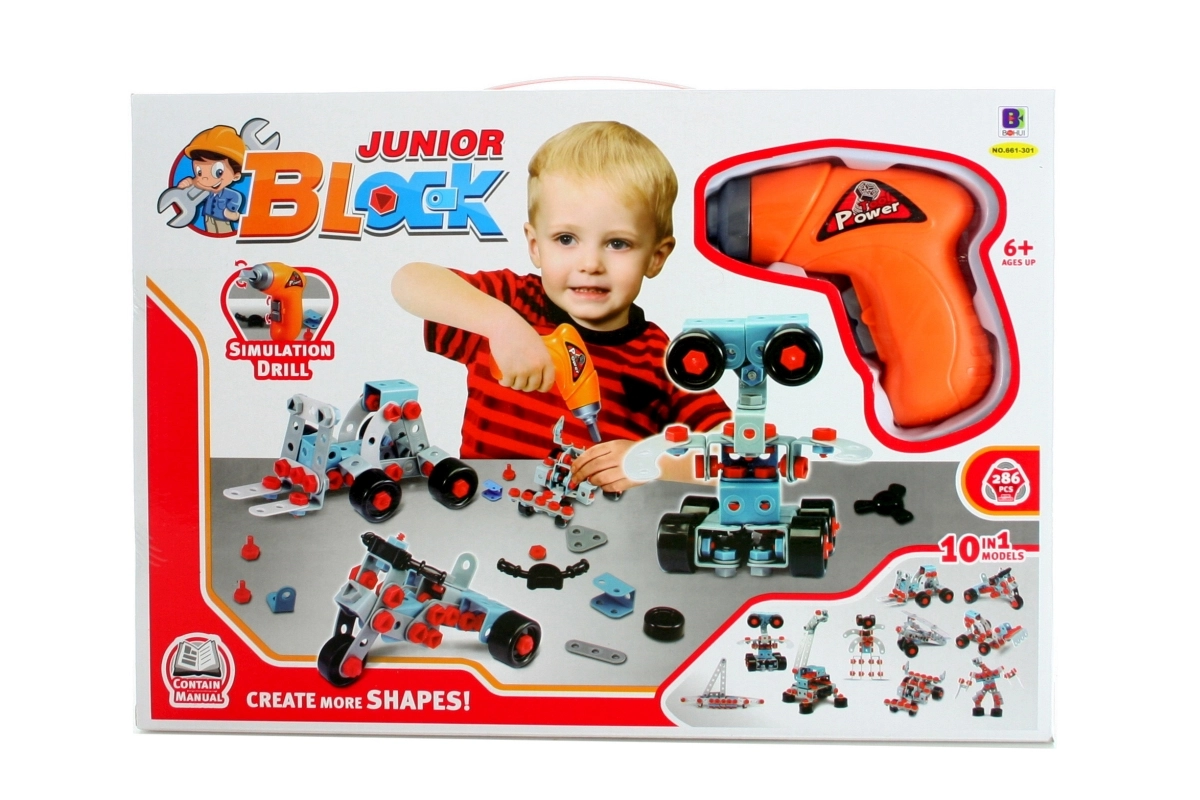 Fejleszd a kreativitást és a finommotorikát a sokoldalú Junior Block építőkészlettel. A készlet 286 darabot tartalmaz, köztük egy szimulációs akkumulátoros fúrót, és lehetővé teszi a 6 éves kortól kezdve a gyerekeknek, hogy akár 10 különböző modellt építsenek járművekből, robotokból és egyéb szerkezetekből. A praktikus csomagolás (kb. 41 × 29 × 6 cm) és a könnyű csavarozás műanyag csavarokkal és anyákkal órákra leköti a gyerekeket. A fúrógép 2× AA elemmel működik (nem tartozék).