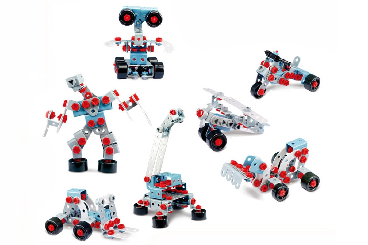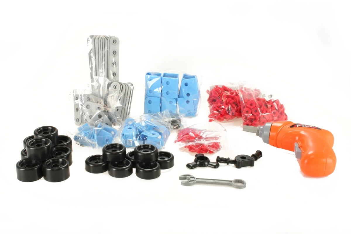 Moduláris tartóelemek, csatlakozók, kerekek és csavarok teszik lehetővé az ismételt átépítést. Ideális a finommotorika és a műszaki gondolkodás fejlesztésére.