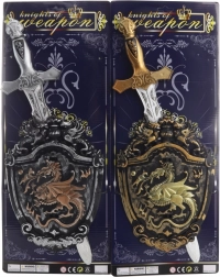 Műanyag kard kb. 49 cm-es méretben és pajzs kb. 26 x 19 cm-es méretben. A csomagolás mérete kb. 52,5 x 21 x 2 cm. Ajánlott életkor: 3+