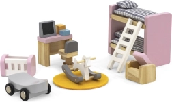 Számítógépes íróasztal székkel, létrás emeletes ágy, bölcső, hintaló, járgány, puff és szőnyeg – mindez finom pasztellszínekben összehangolva a valósághű játékért.
