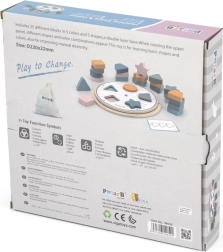 Okos, fa fejlesztőjáték a legkisebbeknek, amely ötvözi a formák és színek válogatását, fejleszti a finommotorikát és a logikus gondolkodást. A készlet részei fa elemek, forgatható tábla, sablonkártyák és textil tasak. A POLARB kollekcióba tartozó játék minőségi fából készül, nem mérgező festékekkel, lágy pasztell árnyalatokban színezve, és egyszerre szórakoztat, tanít és fejleszt már egészen kicsi kortól.