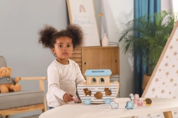 Minőségi fa, lekerekített élek és kellemes színek biztosítják a biztonságos játékélményt a legkisebbek számára is. Ideális a gyerekszobába és utazáshoz.