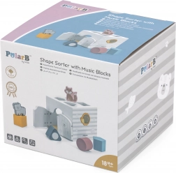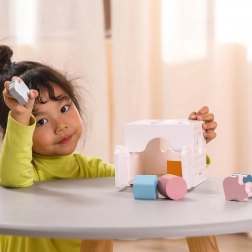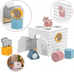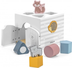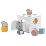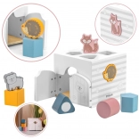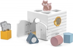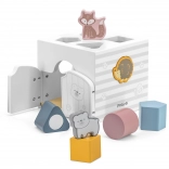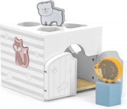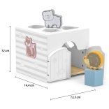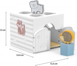 Fa állatos bedobó játék. A kockák csörögnek. A bedobó mérete kb. 13,5 × 12 × 14,4 cm. A csomagolás mérete kb. 15 × 14,5 × 13 cm. Ajánlott életkor: 18 hónap+
