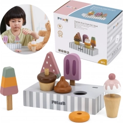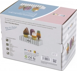 Az 5 fa jégkrémből álló, csábító színű készlet végtelen szórakozást kínál a gyerekeknek. A jégkrémek egy stabil fa állványon kapnak helyet, amely kiállításra és áttekinthető tárolásra is szolgál. Minden minőségi fából készült, biztonságos, nem mérgező festékekkel színezve.