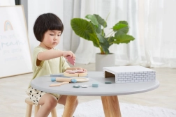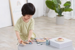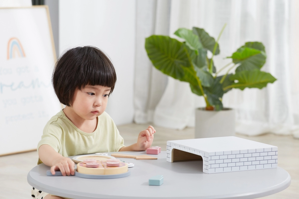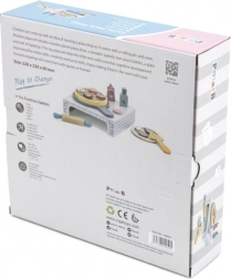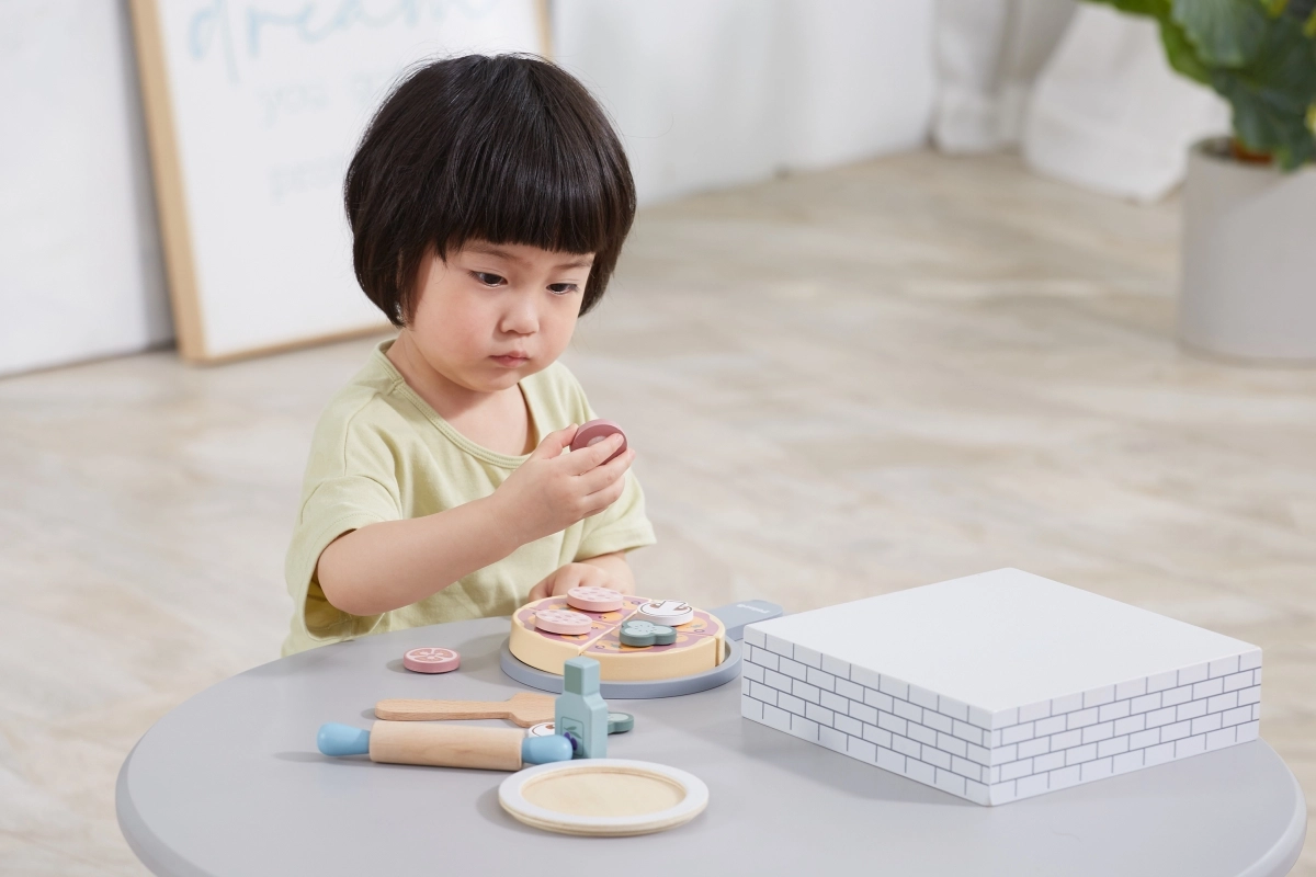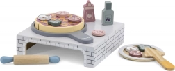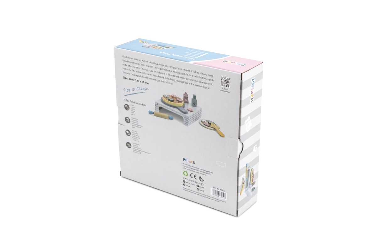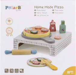 Ez a fa házi pizza készlet meghitt pizzériává változtatja a gyerekszobát. A kicsik kinyújthatják a tésztát, összeállíthatják a feltéteket, süthetnek a kemencében, majd tányérra tálalhatnak – akárcsak a való életben. A levehető feltétek és a szeletelhető darabok fejlesztik a szem–kéz koordinációt és a fantáziát.