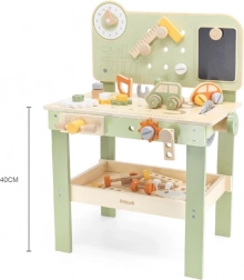 Stílusos gyerek munkapad természetes–zöld színösszeállításban, amely valósághű műhelyélményt nyújt biztonságos, fából készült formában. A gyerekek csavarozhatnak, kereket cserélhetnek az autócskán, „vághatnak” elemeket, összeállíthatják a fogaskerekeket, és felfedezhetik az ok-okozati összefüggéseket. Az áttekinthető tárolómegoldásnak köszönhetően minden alkatrész és szerszám mindig kéznél van.