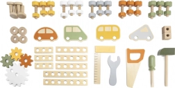 - Gazdag tartozékok: szerszámok, csavarok, anyák, lemezek, fogaskerekek, autócska és mutatós óra.