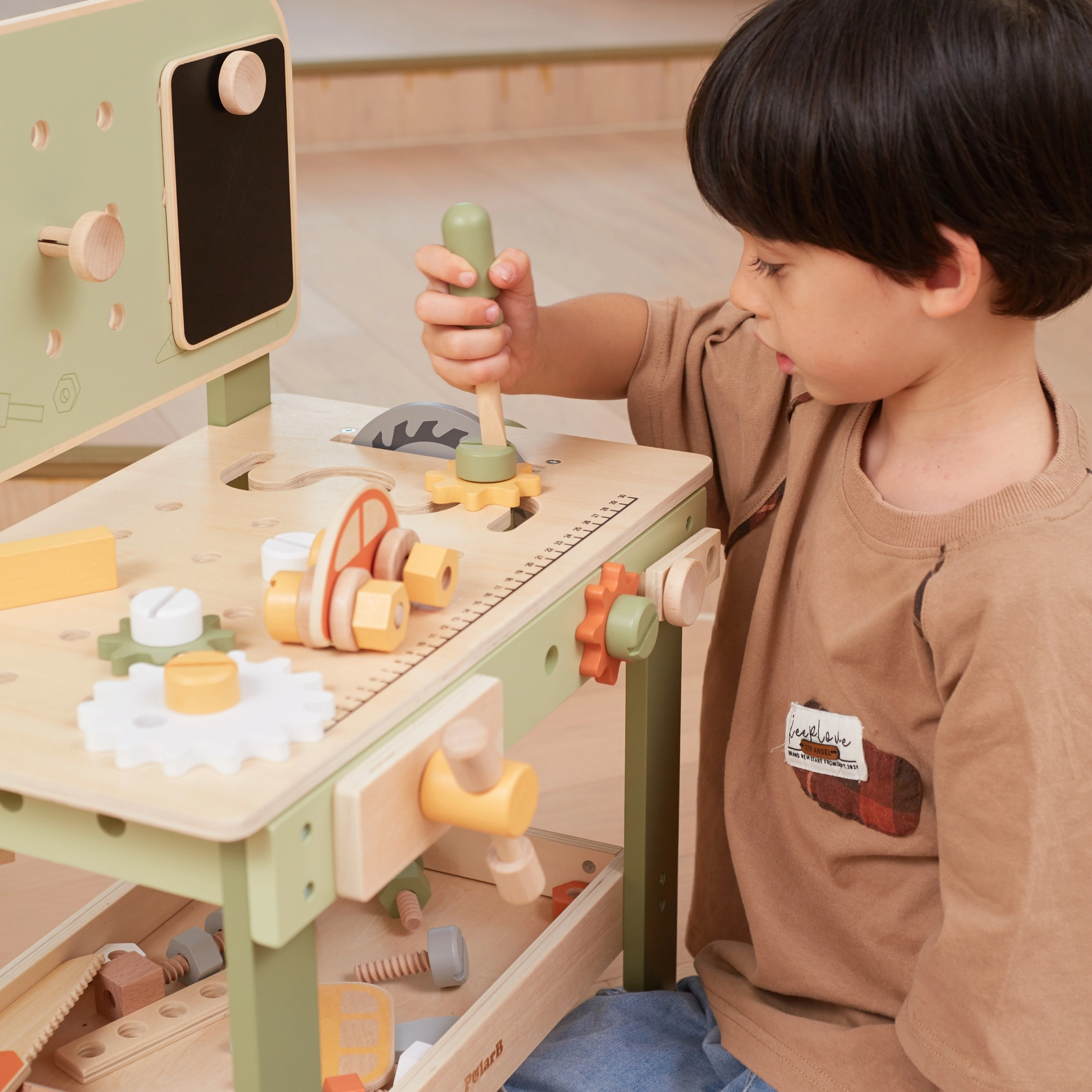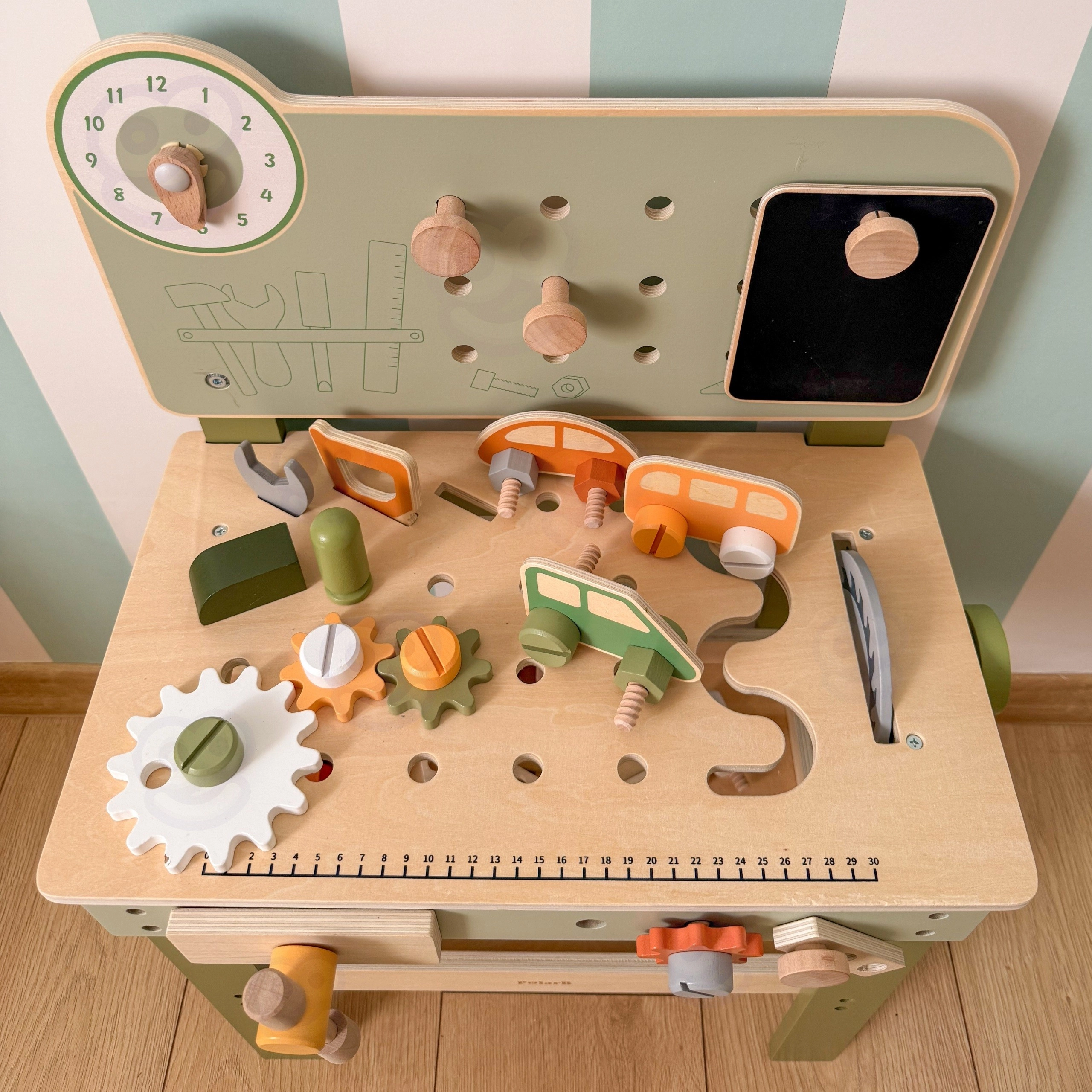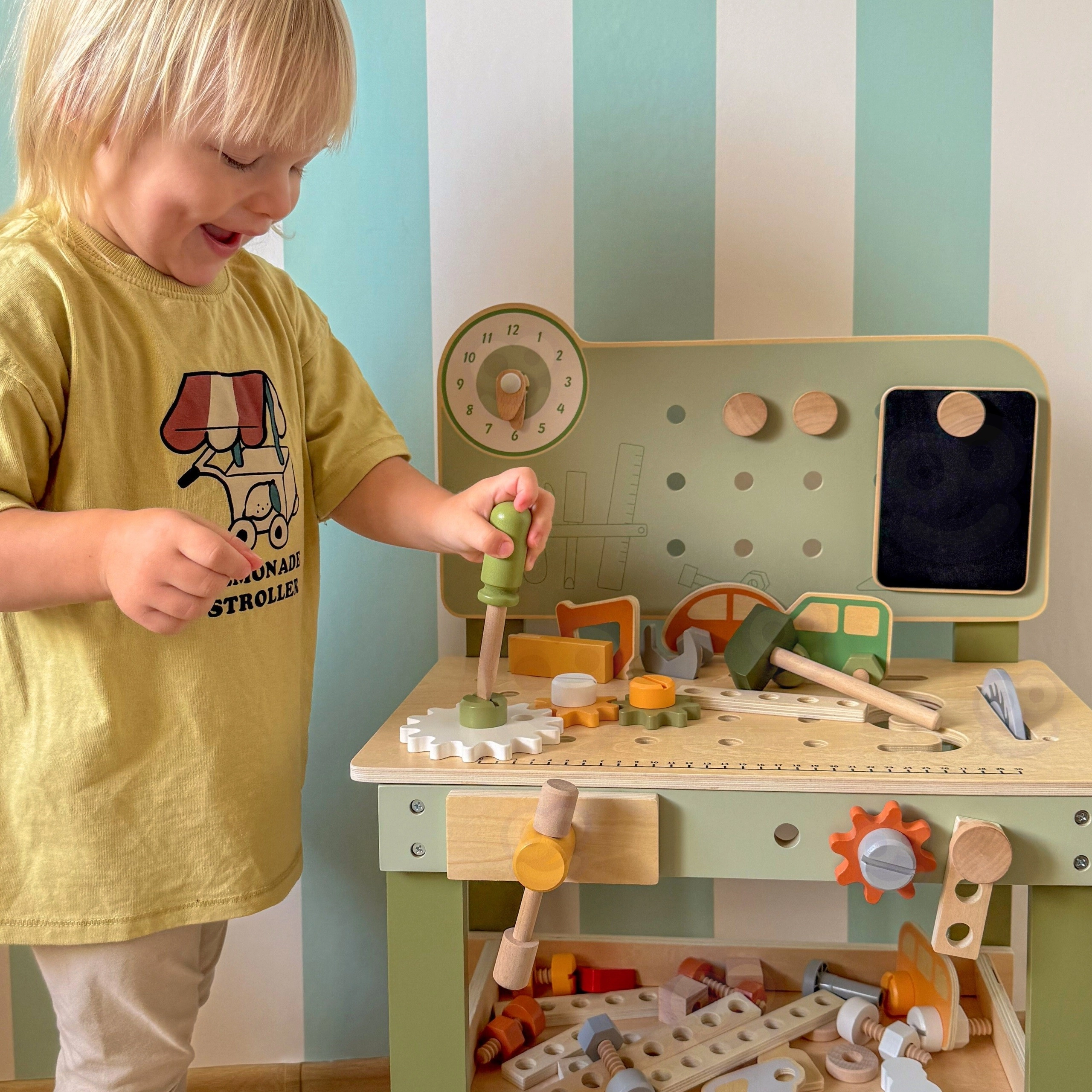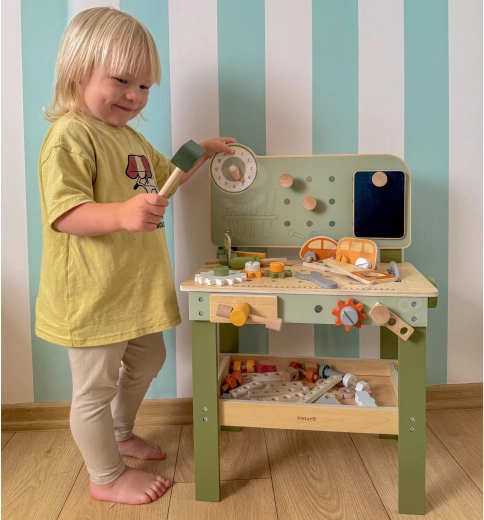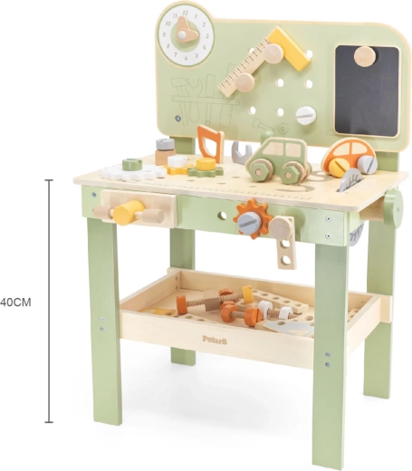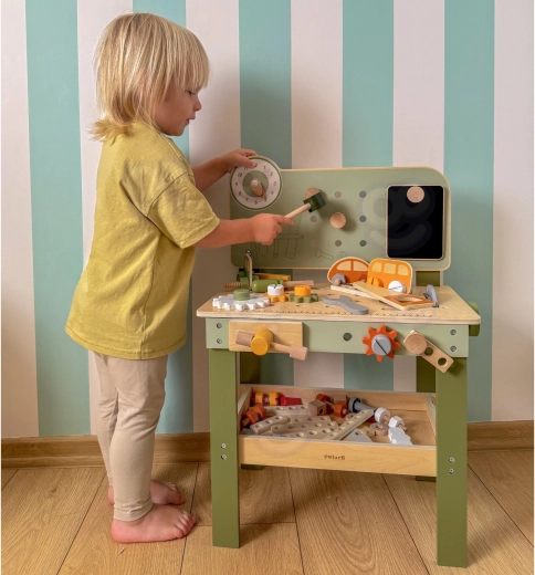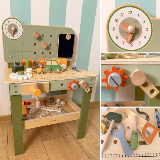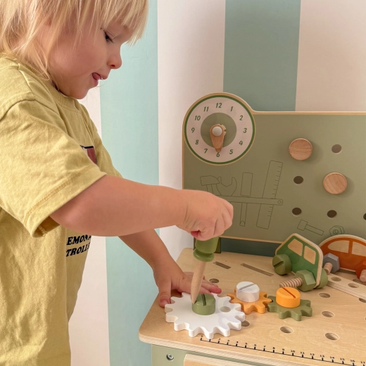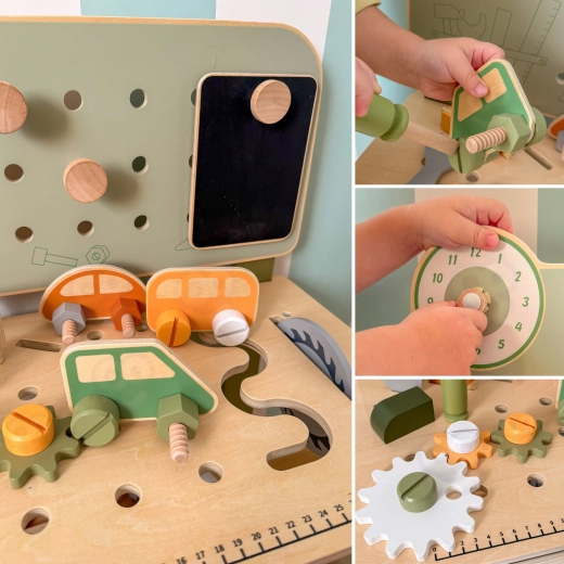 A pegboarddal, mérőskálával és forgó elemekkel ellátott munkapad támogatja a valósághű játékot és a szerszámhasználati készségek fejlesztését.