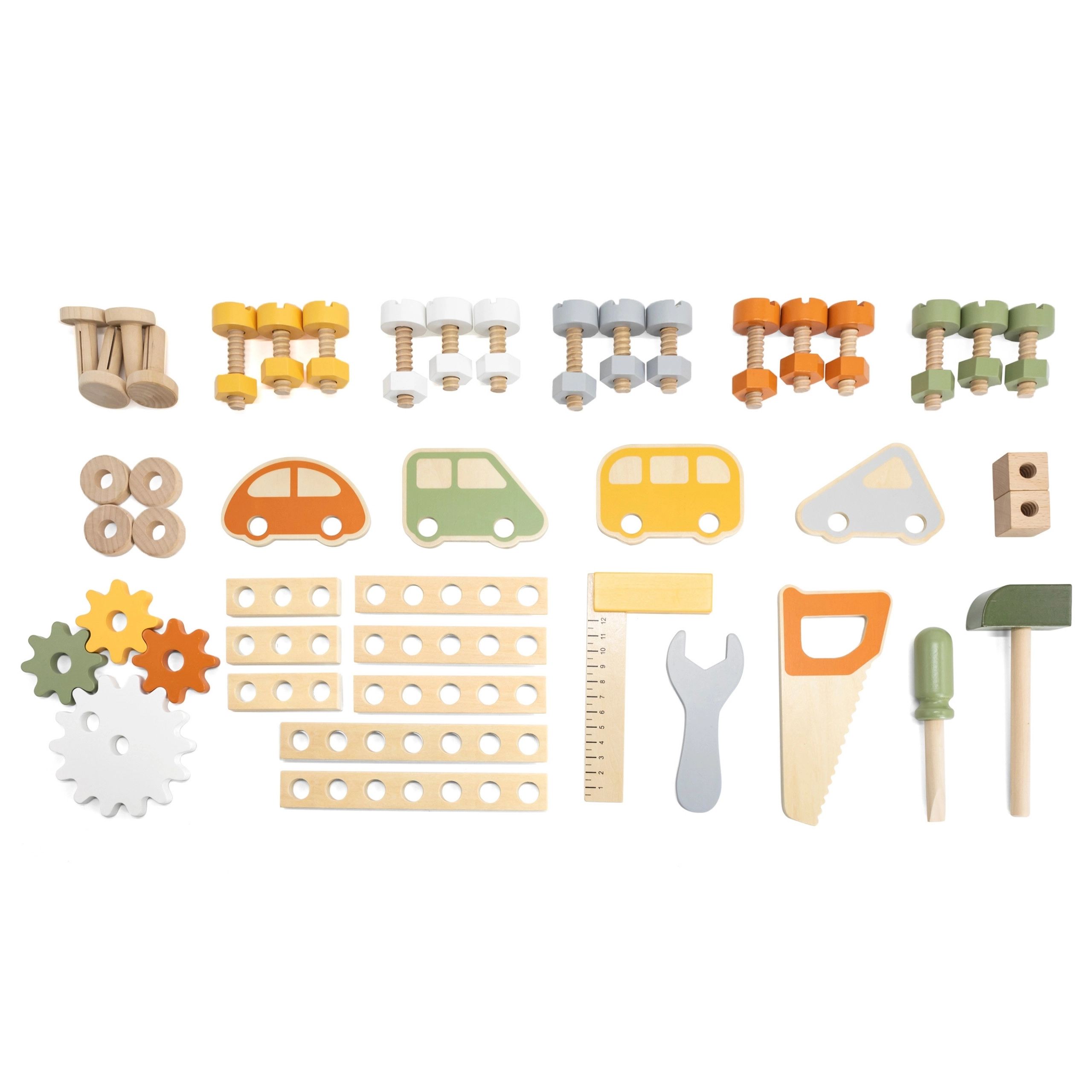 A készlet része egy szerszámcsomag (kalapács, villáskulcs, csavarhúzó), csavarok, anyák, fogaskerekek, panel oktató órával és praktikus polc a lerakáshoz. A gyerekek összeállíthatják saját alkotásaikat, „szerelhetnek” és válogathatják az elemeket – ideális a kreativitás, türelem és tervezés fejlesztéséhez.