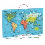 A térkép 106 mágneses elemből áll, amelyek országokat, közlekedési eszközöket és állatokat ábrázolnak, megkönnyítve a földrajz tanulását.