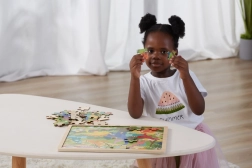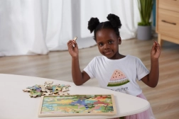 A masszív fa tálca helyén tartja a darabokat, megkönnyíti a szállítást és a tárolást, valamint segít a gyerekeknek a kép kirakására összpontosítani.