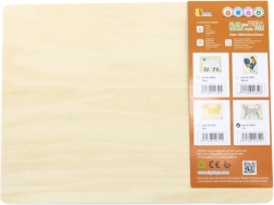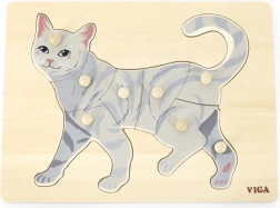 A gyermek feladata, hogy a macska képét ne csak az illusztráció, hanem az egyes elemek formája alapján is kirakja. Gombfogantyúk könnyítik meg a megfogást az apró ujjaknak, és segítik a kéz helyes vezetését. A masszív fa alaplap biztosan a helyén tartja az elemeket, és ellenáll a mindennapos használatnak.