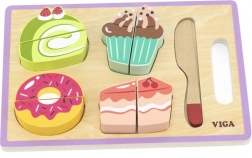 Fedezd fel a kreatív játékot a VIGA My Cutting Dessert fa készlettel. A négy színes desszert a tépőzáras kapcsolódásnak köszönhetően biztonságosan „vágható” a fa késsel 8 részre és újra összerakható. A tálca könnyen megfordítható és vágódeszkaként használható, ami támogatja a hiteles játékot a gyerekkonyhában.