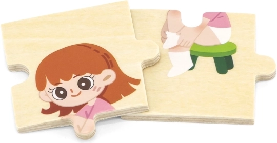 Ez a minőségi, fából készült oktatójáték a helyes öltözködési sorrendet tanítja meg a gyerekeknek egymásra épülő elemek kirakásával, fiú és lány ábráival. Minden elem egyedi motívummal rendelkezik és pontosan illeszkedik, így játék közben a gyerekek gyakorolják az összefüggések felismerését és a türelmet.
