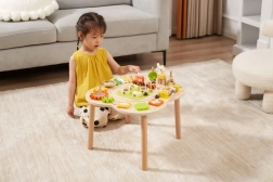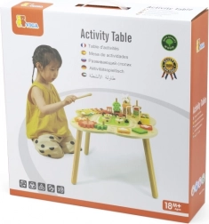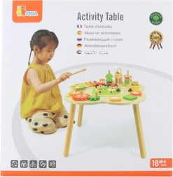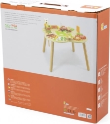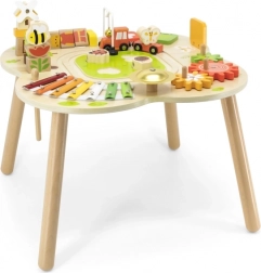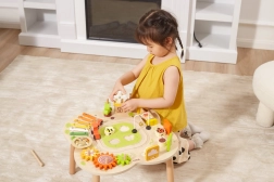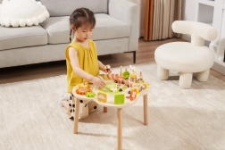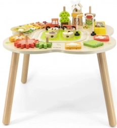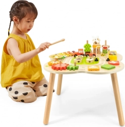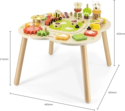 Az asztal felületét biztonságos, nem mérgező festékekkel kezelték élénk árnyalatokban, amelyek természetesen motiválják a gyerekeket a felfedezésre. A gazdag felszereltség – a fogaskerekektől a xilofonon és csengettyűn át az ügyes kirakókig és a vonatpályáig – hosszan tartó, értelmes szórakozást garantál a Montessori szellemében.