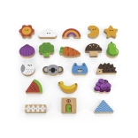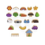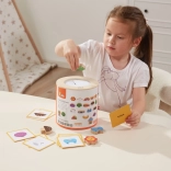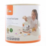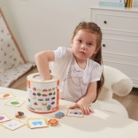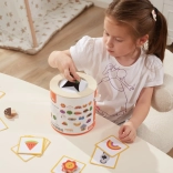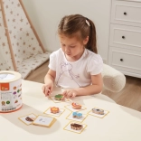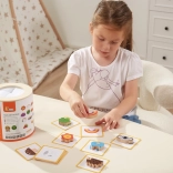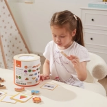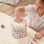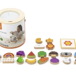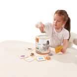 Fogd meg és keresd meg játék. A csomag 20 darab kockát, egy papír vödröt, 20 játékkártyát és egy fedelet tartalmaz. A csomag mérete kb. 16 × 15,5 cm. Ajánlott életkor: 3+