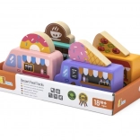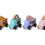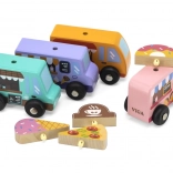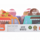 A Viga fa food truck készlet négy bájos, kerekeken guruló járművet tartalmaz pasztellszínekben, részletgazdag nyomatokkal. Minden truckhoz tartozik egy tematikus banner – pizza, kávé, fagylalt és fánk –, amelyek tetszés szerint felcserélhetők, így a gyerekek saját történeteket és üzleteket alkothatnak. A minőségi fa és a nem mérgező festékek biztonságos és tartós szórakozást garantálnak.