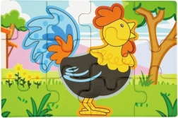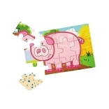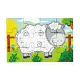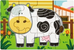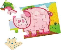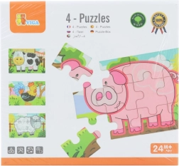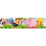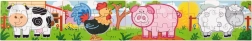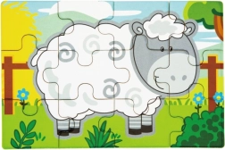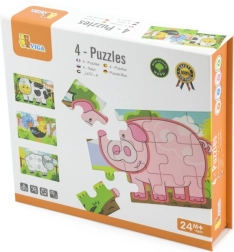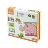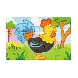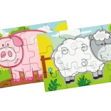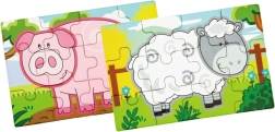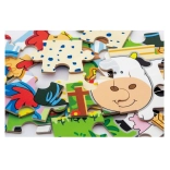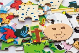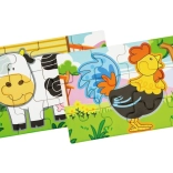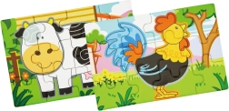 Fa puzzle farm motívokkal. A csomag összesen 4 képet tartalmaz (összesen 48 darab). A kirakókból az összes 4 állat egyetlen hosszú képe is összeállítható. A csomag mérete kb. 20,5 × 19,5 × 4,5 cm. Kor: 24 hó+