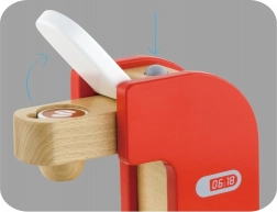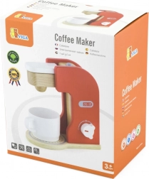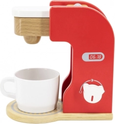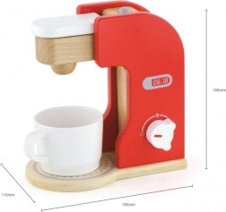 Vörös kávéfőző természetes fa elemekkel, ami az igazi készülékeket utánozza és szórakoztató játékélményt nyújt.