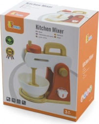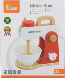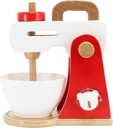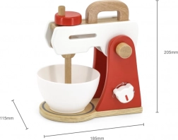 A mixer piros-fehér dizájnnal és fa elemekkel büszkélkedhet, amely valósághű másolatot nyújt a valódi konyhai eszközök közül.