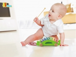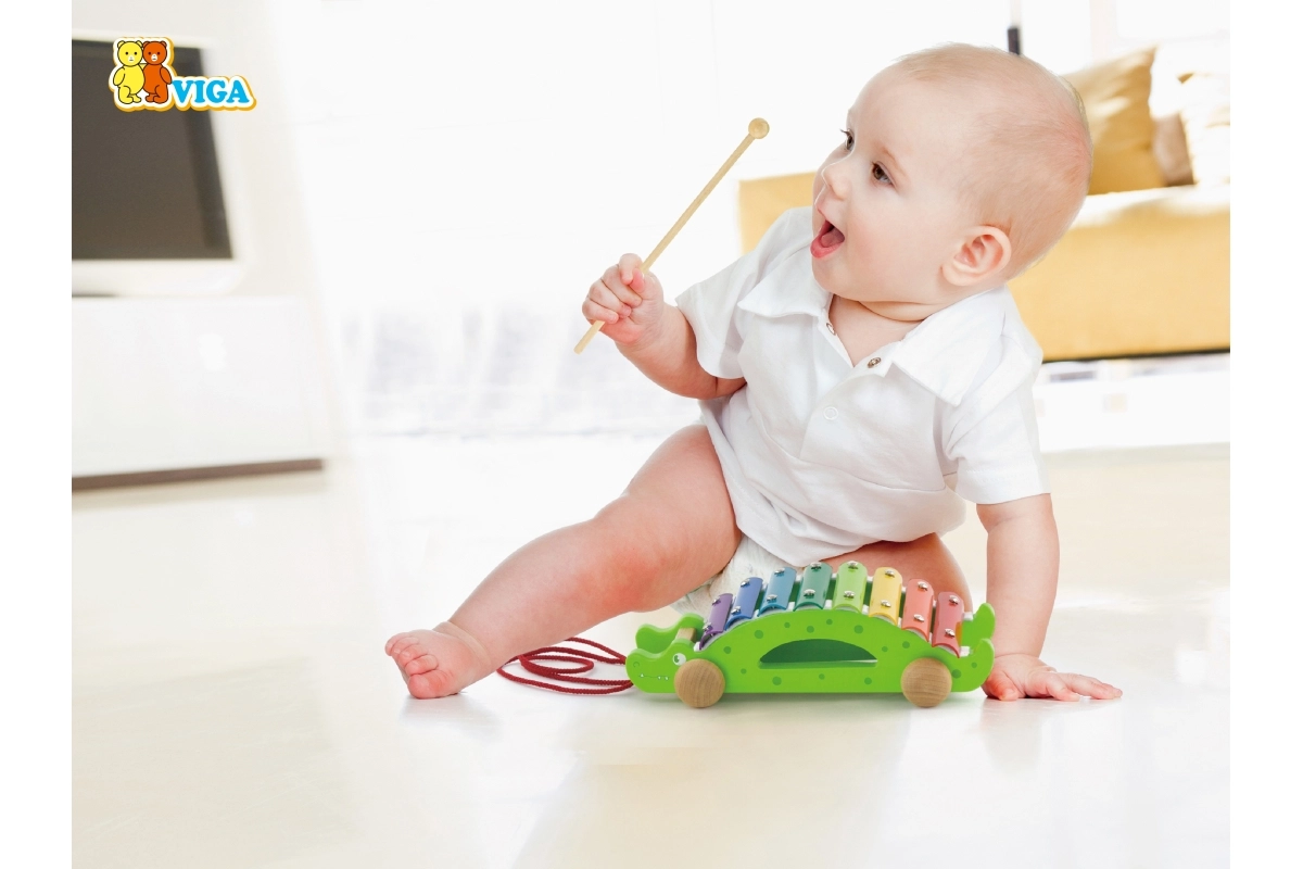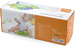 A színes xilofon billentyűk a hangok felfedezésére és a ritmus tanulására ösztönöznek, miközben a krokodil kerekeken gurul a gyermek után.