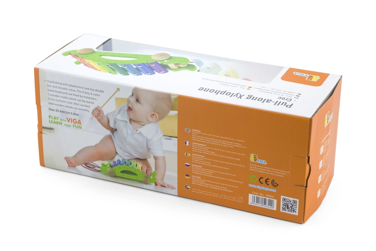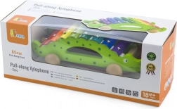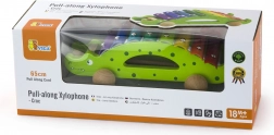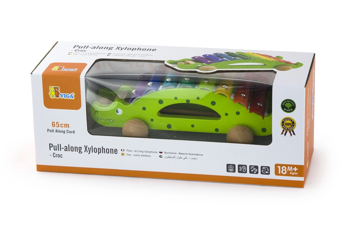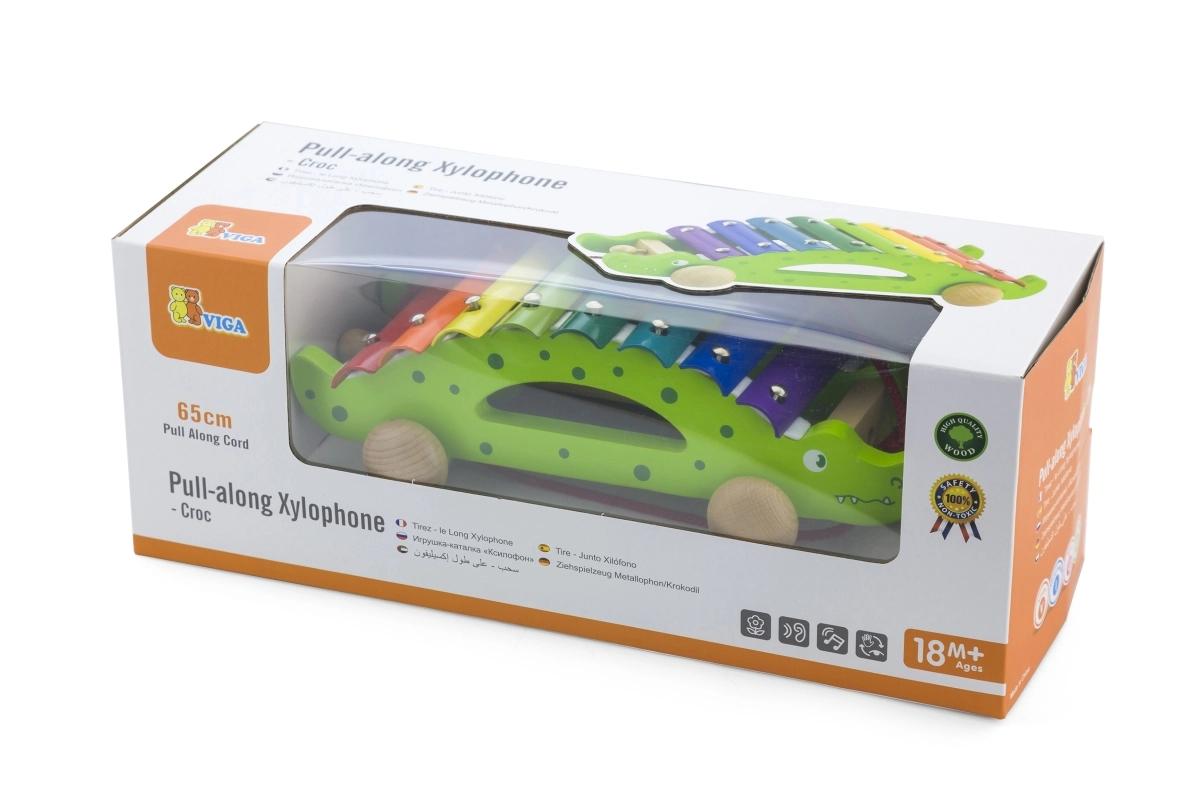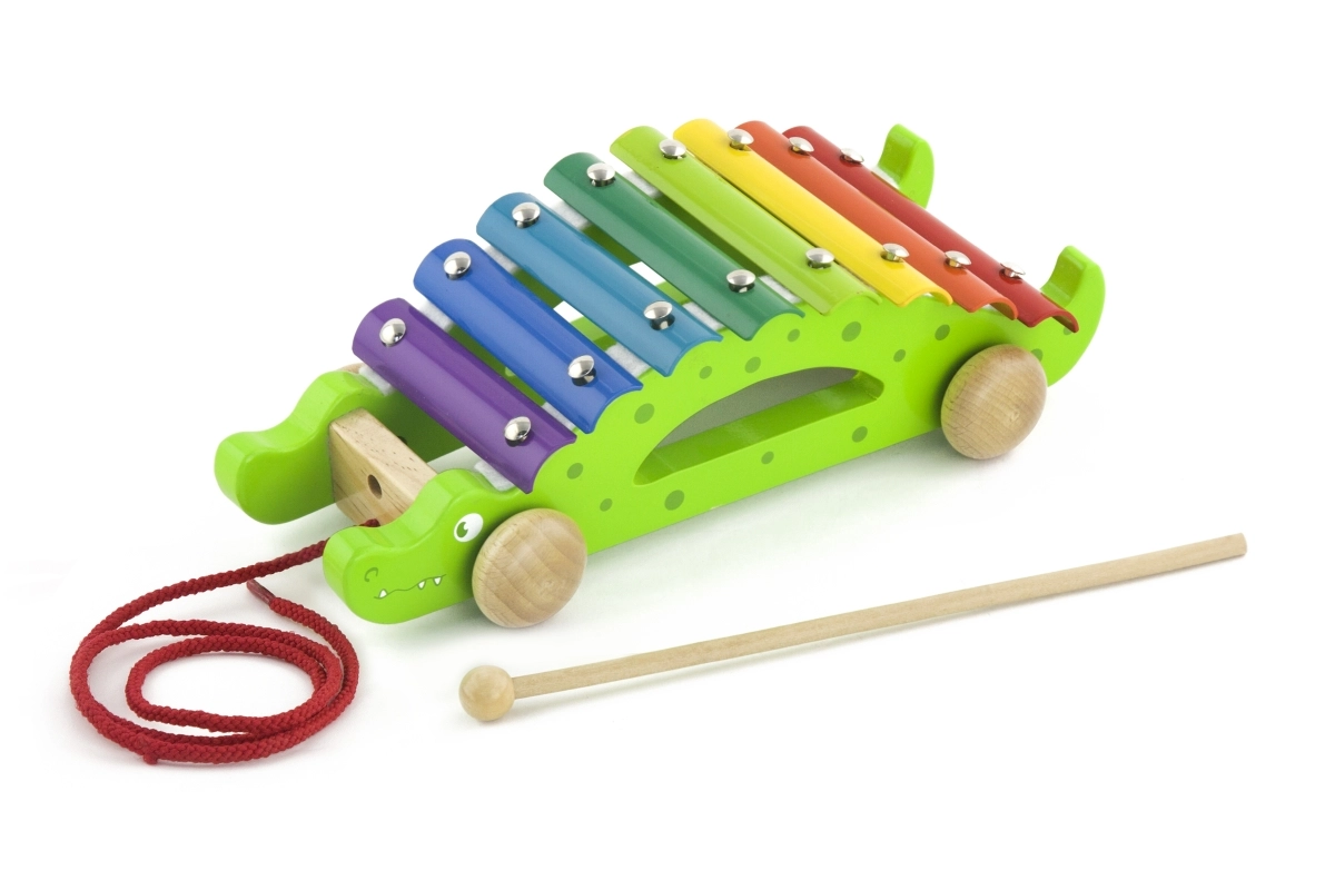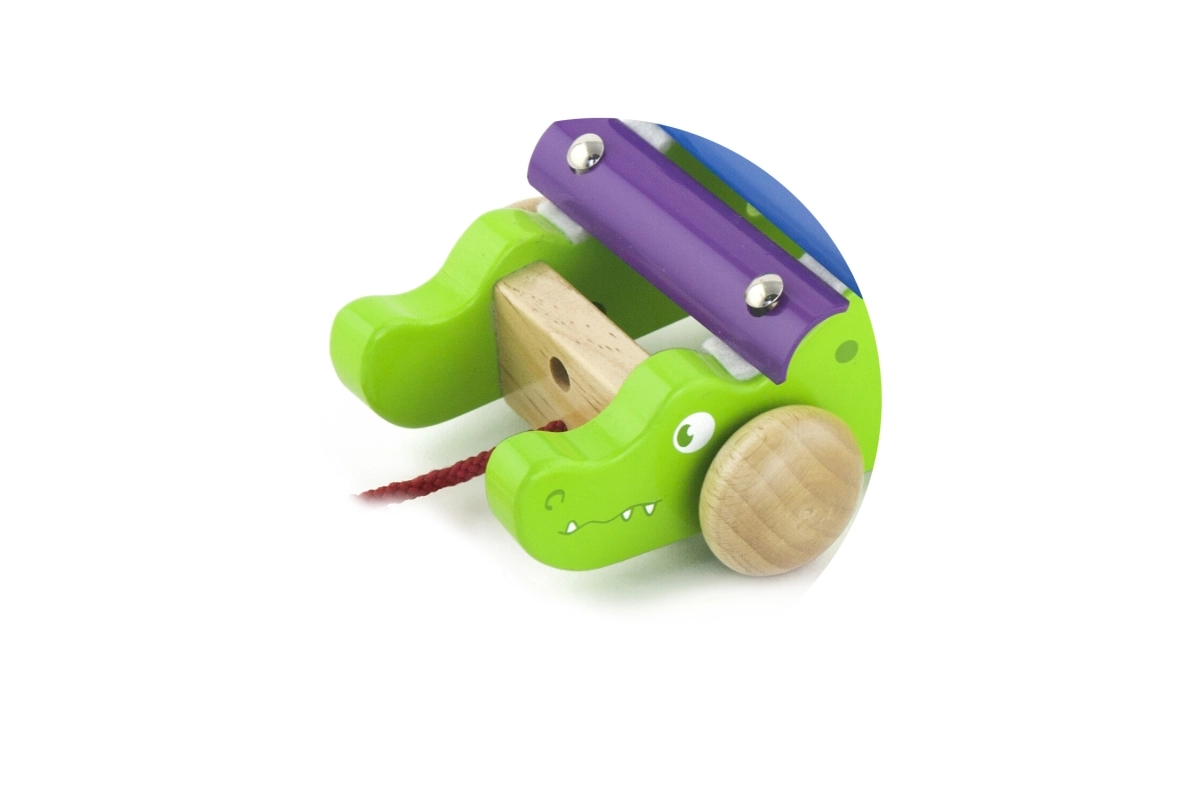 A fa húzható xilofon krokodil ideális játék az első zenei lépésekhez és a nagymozgások fejlesztéséhez. A gyerekek maguk után húzhatják, miközben dallamokat játszanak a színes fém billentyűkön. A robusztus fa kivitel és a sima élek biztonságos játékot garantálnak a legkisebbeknek, 18 hónapos kortól.