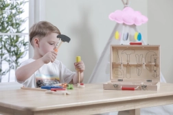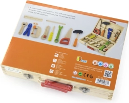 Ajándékozzon a gyerekeknek élethű játékélményt gondosan megmunkált fa szerszámokkal, praktikus bőröndben. A készlet tartalmaz kalapácsot, fűrészt, villáskulcsot, csavarhúzót és más kedvelt eszközöket, amelyek segítik az ügyesség és a képzelőerő fejlődését. A fa kivitelnek köszönhetően a játék tartós, kellemes tapintású és biztonságos a kis kezek számára.