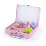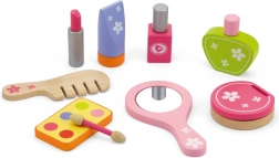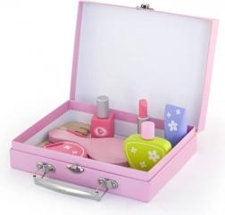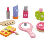 Stílusos fa szépségkészlet kis parádésoknak praktikus bőröndben, amely minden 3 évesnél idősebb gyermeket megörvendeztet. Mindent tartalmaz a valósághű szépségszalonos játékhoz – fésű, tükör, körömlakk, rúzs, parfüm és további kiegészítők. A masszív fának és a simára megmunkált elemeknek köszönhetően a játék biztonságos és tartós. Fejleszti a fantáziát, a finommotorikát és a szociális készségeket.