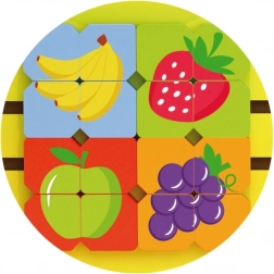 A tábla különböző gyümölcsöket ábrázoló puzzle-t kínál, amelyeket a gyerekek tologathatnak, és felfedezhetik a különböző formákat és színeket.