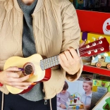 A gitár elegáns dobozban, pengetővel érkezik – tökéletes ajándék kis zenészeknek.